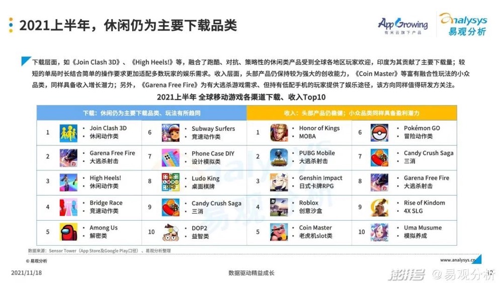 例如:头部的如三七互娱的《Puzzles&Survival》融合了三消和SLG,久居出海畅销榜。中小厂的如《Join Clash 3D》、《High Heels》融合了跑酷、对抗、策略性等元素,占据2021上半年下载榜前列,其中《Join Clash 3D》主要下载量来自出海较冷门的印度市场。(易观)