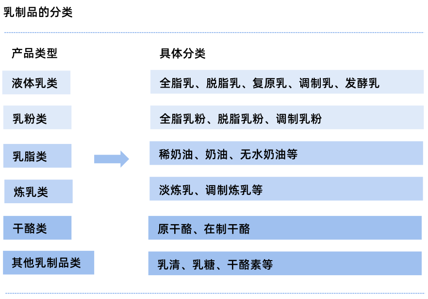 液态奶包括鲜奶和酸奶,其中鲜奶指包装牛奶,是可直接零售的消费乳品。干乳制品包括奶粉、乳清、奶油、奶酪和炼乳。而奶粉指全脂和脱脂大包粉,是用于再加工的原料乳品,并不包含婴幼儿奶粉。