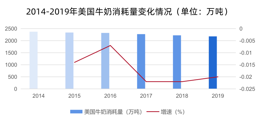 根据美国农业部(USDA)的数据显示,1975至今,美国人均液态奶消耗量下降了40%。2019年美国牛奶消耗量为2178万吨,同比下降2.0%。