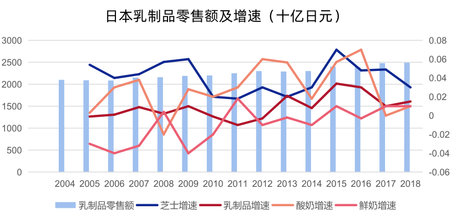 从成长阶段看,1965年之前,日本乳制品的消费量保持双位数的较快的增长;1965-1997年行业依旧保持了30多年的5%之内的量增速;1997年之后行业增速基本稳定,略有下降。
