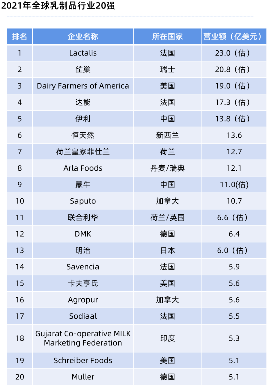 根据荷兰合作银行(RABO BANK NEDERL-ANDS)公布2021年全球乳业20强榜单显示,Lactalis以年营收230亿美元,取代行业巨头雀巢(208亿美元),成为最大乳企,雀巢位居第二。