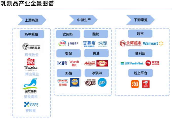 其上游环节是奶牛养殖,其产品原奶是乳制品制造的重要原料;中游则是乳制品加工制造环节,将上游生产的原奶加工制造成各类乳制品;下游则通过超市、便利店、线上平台等线上线下渠道将乳制品销售给消费者。