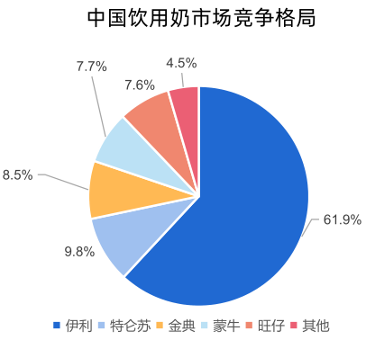 在整体饮用奶市场中(包括常温牛奶、低温鲜奶等),伊利、特仑苏、金典表现突出,占比分别为9.8%、8.5%及7.7%。