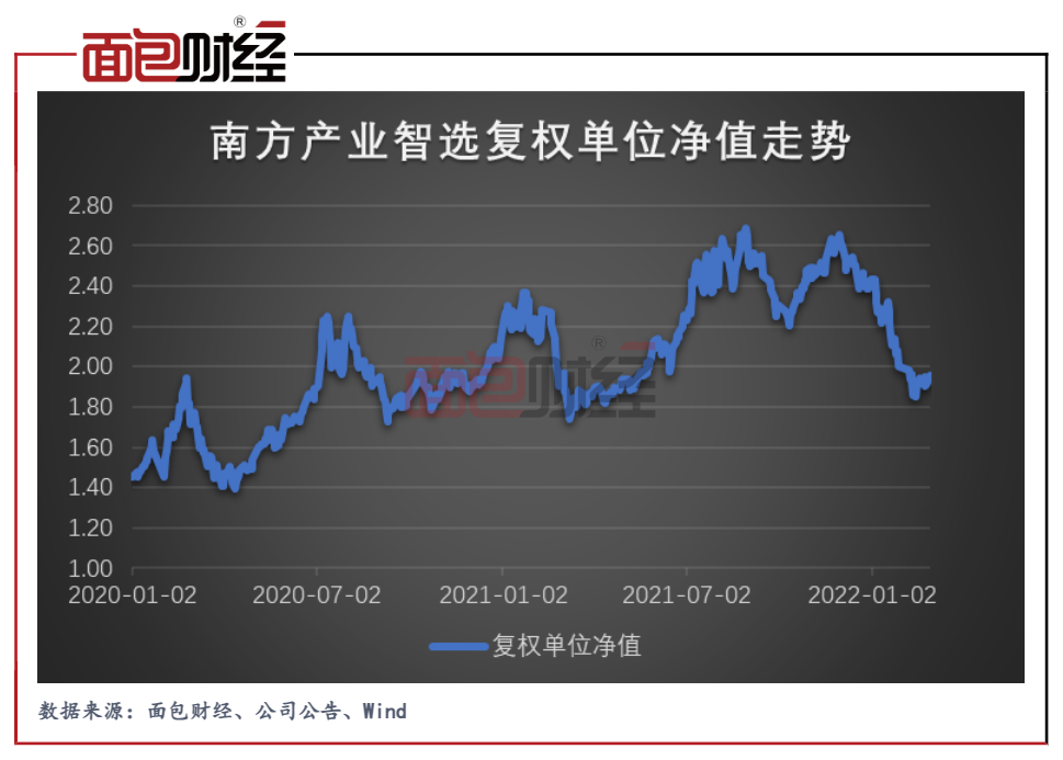 自2021年12月,南方产业智选的单位净值持续下降,截至2022年2月末基金净值已跌至2.0以下,相对前期高点回撤已达到27%。