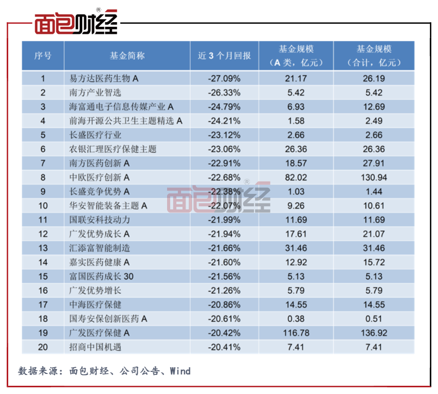 从单只产品来看,易方达医药生物A近3个月回撤位列第一,回撤率达到27.09%。其中不乏一些规模较大的产品,如中欧医疗创新A、广发医疗保健A,两只产品基金总规模超过百亿,近3个月回撤均超过20%。