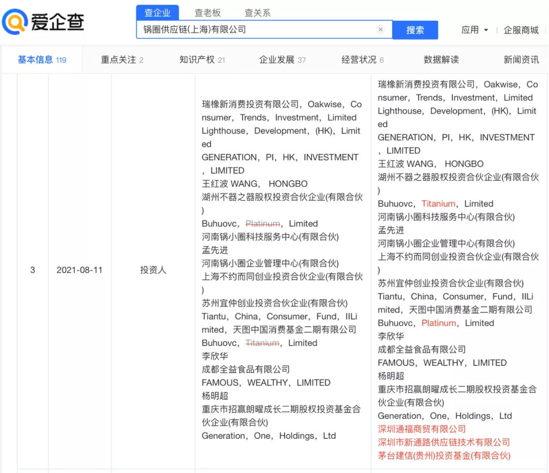 锅圈此前一切成果的取得,离不开资本的加持。据企查查资料显示,2019年8月,获不惑创投4500万元人民币A轮投资;2019年10月,获三全食品5000万元人民币A+轮投资。2020年2月,获嘉御基金、IDG资本、不惑创投5000万美元B轮投资。2020年7月,获嘉御基金、启承资本、IDG资本、不惑创投6000万美元C轮投资。2021年3月获招银国际、天图投资3亿美元的D轮投资。2021年8月获茅台建信基金、物美D轮投资。