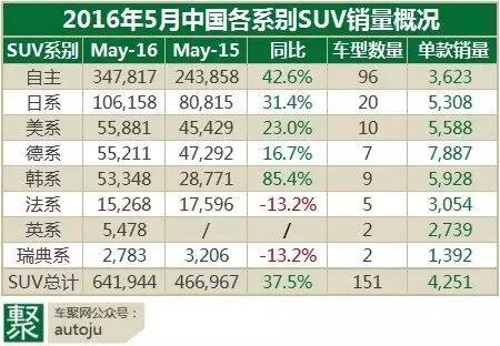 至于法系和瑞典系则是销量下跌,英系的国产路虎尚无同期对比。平均下来,5月份SUV销量同比提升37.5%。这意味着,实际上日系SUV销量增速还不及平均水平,也不如自主品牌;增速最快的倒是上市了途胜和KX5的韩系SUV。