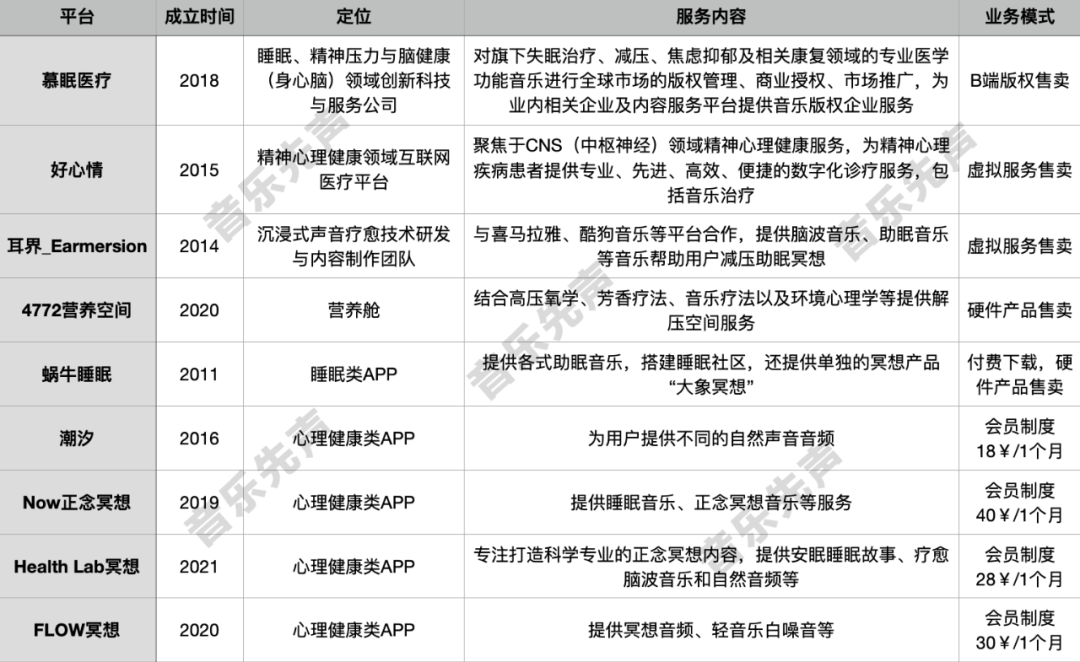 国内如腾讯音乐娱乐也开展了音乐公益计划,帮助自闭症儿童,开展相关音乐治疗项目,旗下酷狗音乐与专家和权威医生开展合作,推出了更具专业性的疗愈音乐专区;网易云音乐则提供了明星哄睡、助眠、冥想、轻音乐、晚安故事、空灵乐器、解压白噪音等音频和音乐的专注冥想专区。