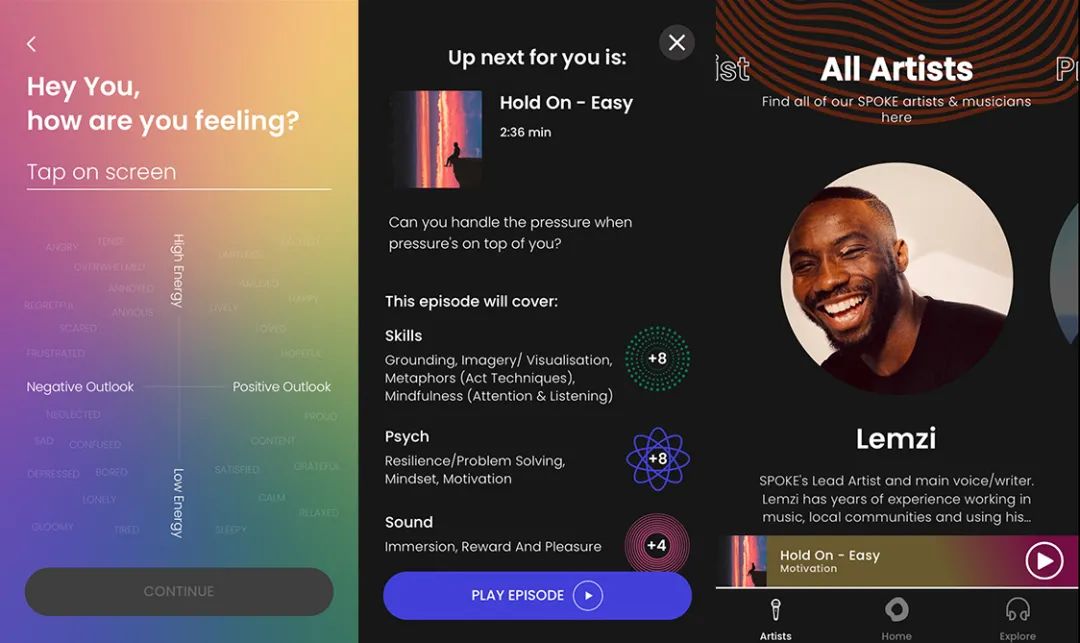 不同于传统冥想类软件提供轻音乐、环境音以及白噪音等音频,SPOKE与25位风格不同的音乐人进行合作,让他们参与到音频内容的制作和引导语的录制环节,尤其是大胆尝试多种曲风,将流行、嘻哈以及R&B等音乐风格与正念深度融合,在正念类音乐的风格选择和内容制作上实现了创新。