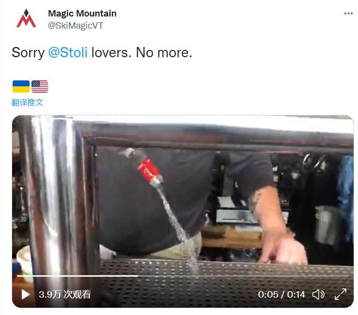 美国佛蒙特州一家滑雪场近期放出视频,显示雪场酒吧正在倒掉一瓶伏特加。视频配文称,抱歉Stoli爱好者,再也没有了。
