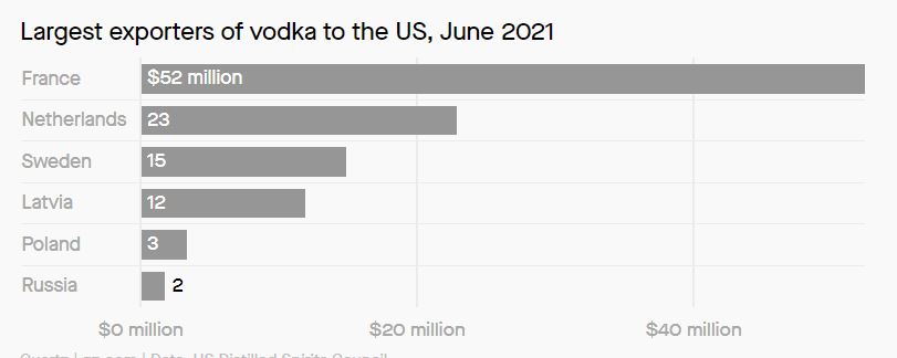 欧洲消费的伏特加中仅有3%为俄罗斯品牌,英国、德国和拉脱维亚是俄罗斯伏特加最大进口国。2021年上半年,美国进口的伏特加中只有约1.5%来自俄罗斯。现在法国、荷兰、瑞典和拉脱维亚才是美国进口伏特加的主要来源国。