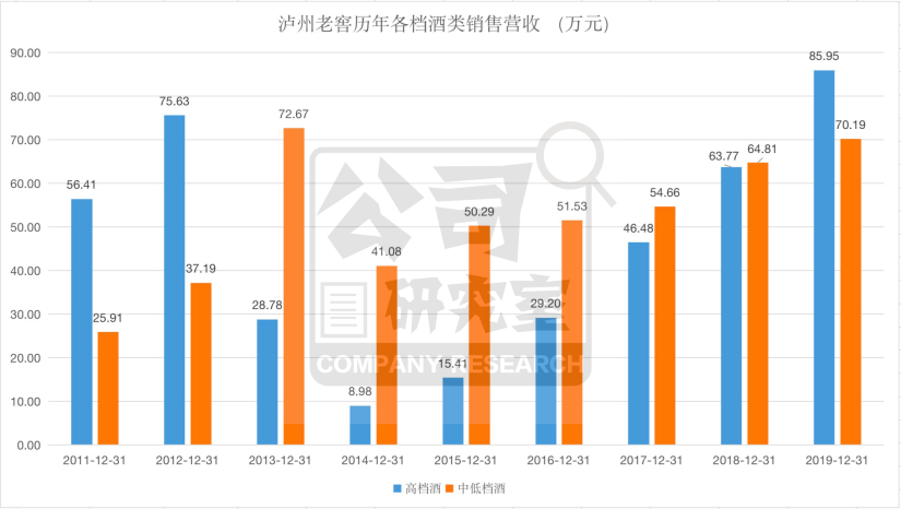 在这漫长的七年间,泸州老窖逐步将资源向中高端品牌倾斜,终于成就了国窖1573这个营收过百亿的超级大单品,公司整个营收结构也随着改变。财报显示,2019年时,公司高档酒营收终于超过中低档酒,出现质的转变。