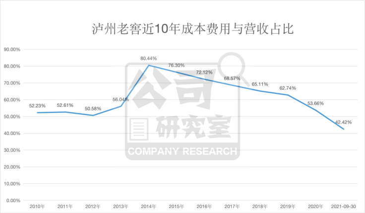 而更长时间的财报数据显示,2010-2021年间,泸州老窖成本费用占营收比例也是居高不下。其中,超过65%的年份有5年,占比41.67%。当然,2014年达到峰值后,这一指标一直在下降。但随着泸州老窖1952这一新品的推出,这个指标能否继续改善,尚待观察。