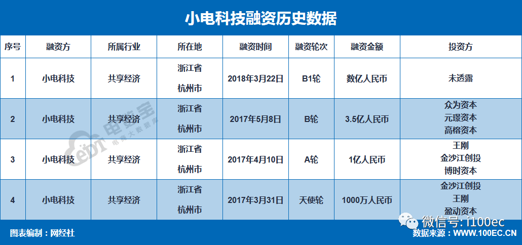 小电科技作为曾经“三电一兽”中的一员,备受资本青睐。据网经社“电数宝”(DATA.100EC.CN)电商大数据库显示,小电科技一共进行过4轮融资,融资总额超5.1亿人民币,估值26亿人民币。