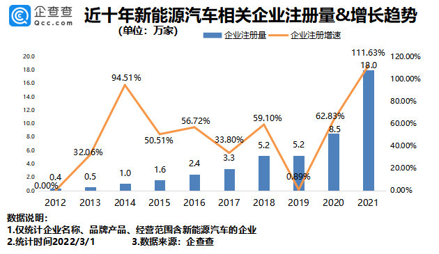 企查查数据显示,我国现存新能源汽车相关企业45.2万家。近10年来,我国新能源汽车相关企业注册量不断增长。2019年后,我国新能源汽车相关企业注册量突增。2019年新增新能源汽车相关企业5.2万家,同比增长0.89%。2020年新增8.5万家,同比增长62.83%。2021年新增18.0万家,同比增长111.63%。