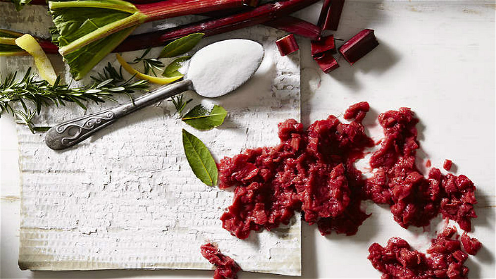 这是一种掌叶花朵呈穗状的植物,在中国它是被当做一味中药的“大黄(rhubarb)”,但到了欧洲它则被用作美味食材,名叫“火参”,红色、酸口、气味清香。每到春末夏初熟成季节,人们就把它和上大量糖霜做成酸奶、果酱、奶油馅饼、果汁冰糕。