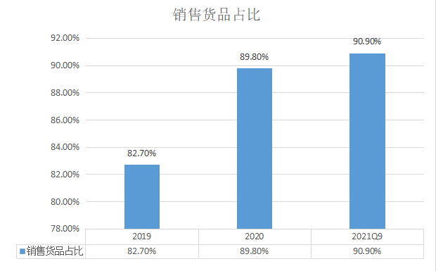 据最新数据显示,截至2021年9月,杨国福来自加盟店餐厅的收入为10.97亿元,占比为94.3%,而比例最低的2019年也能达到87.6%。在占比极高的加盟店收入中,加盟费及系统维护费最高一年仅为5.6%,真正创造收入的是货品销售。