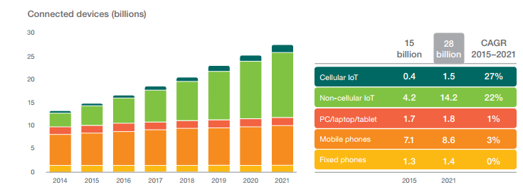 到2021年,将有280亿部移动设备实现互联,其中,IoT(物联网)设备将达到160亿部。