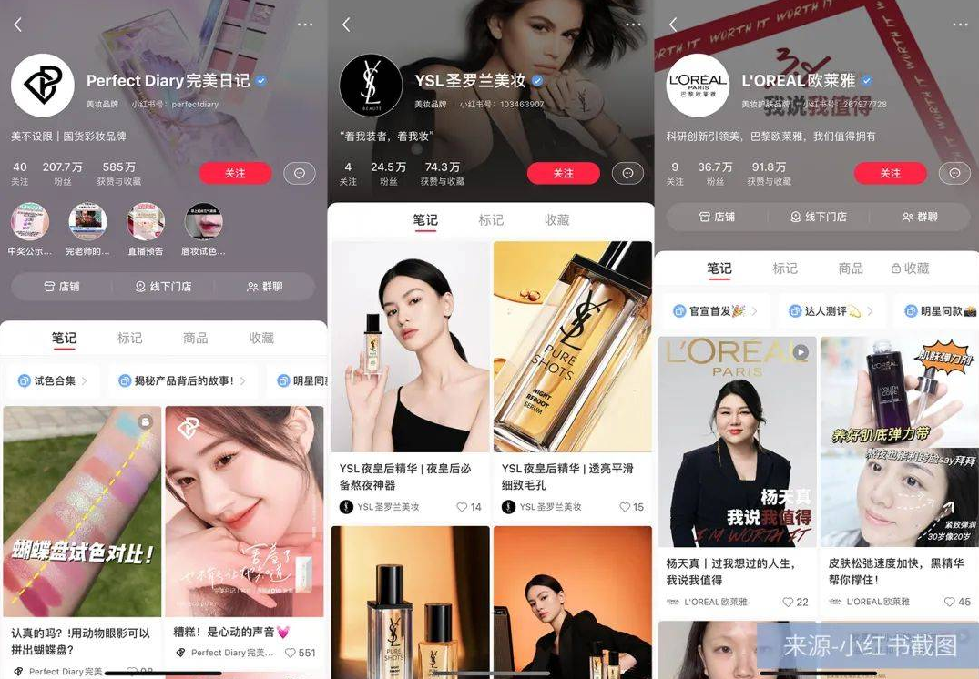 截至目前,完美日记在小红书拥有207.7万粉丝,获赞和收藏数超过了585万,总曝光量上亿。相比之下,国际品牌YSL的粉丝仅有24.5万,欧莱雅也仅有36.7万。
