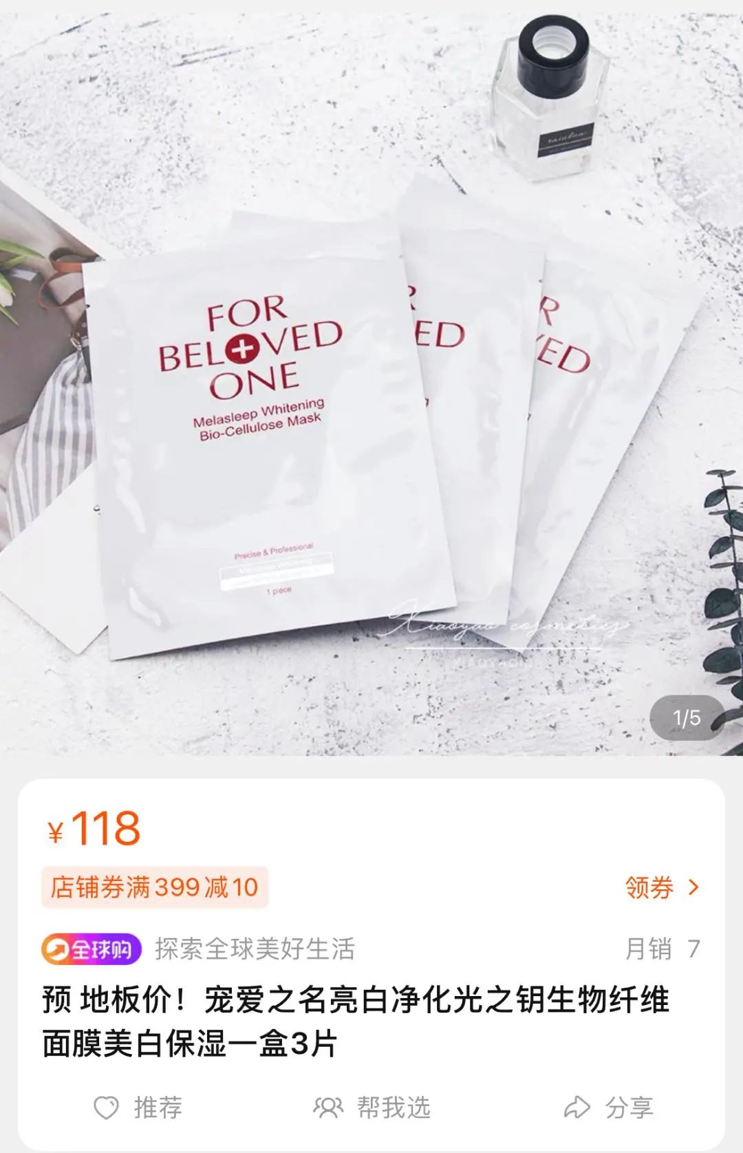 如曾经被大S推荐成为网红的品牌——宠爱之名,最热销的面膜一片价格在110+,但近年来热度迅速下降,在面膜品类越来越“卷”之后,宠爱之名失去竞争力,各个渠道也开始低价清货,目前C店的价格降到30+一片,相当于3折清仓。
