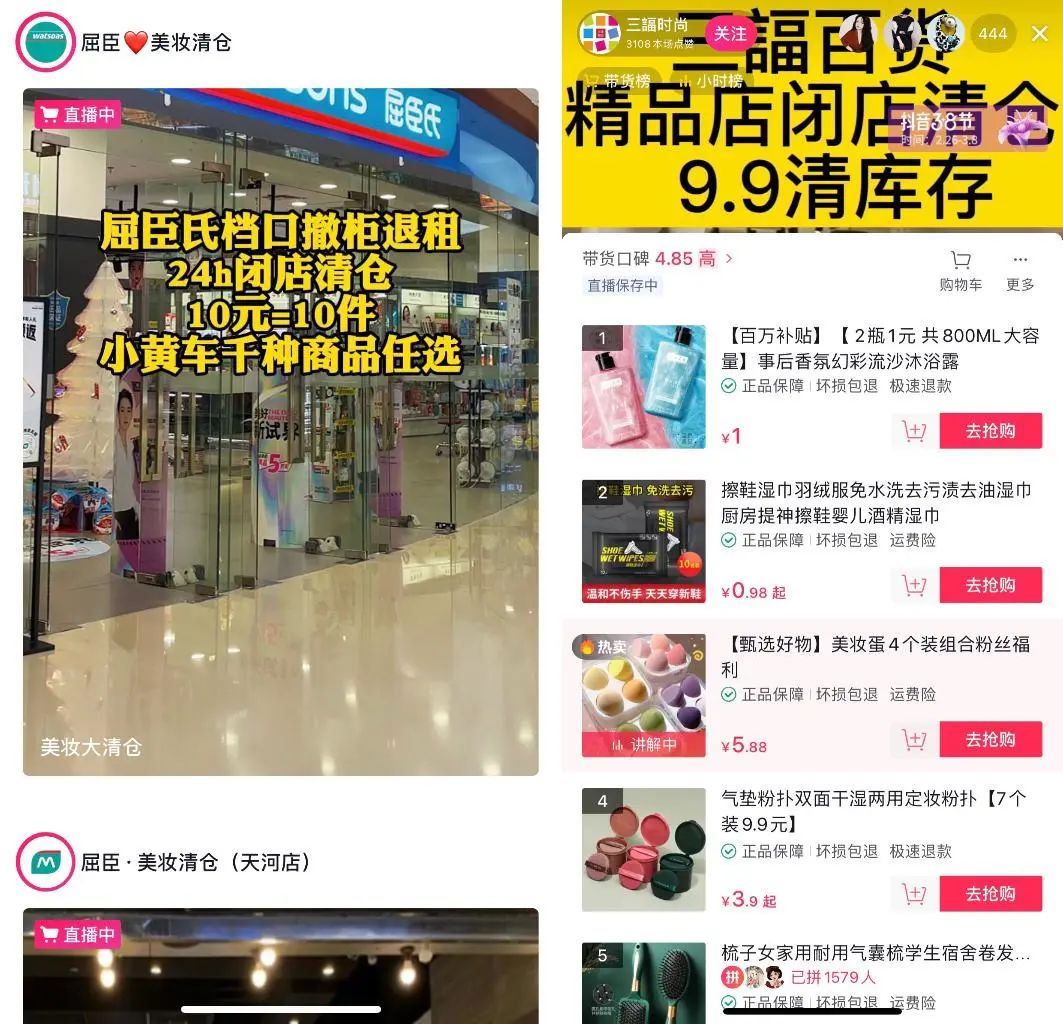 多个名为“屈臣 美妆清仓”“三諨时尚”的直播间出现,直播场景为屈臣氏、三福门店外,标着上述字句,主播不露脸,一直在重复: