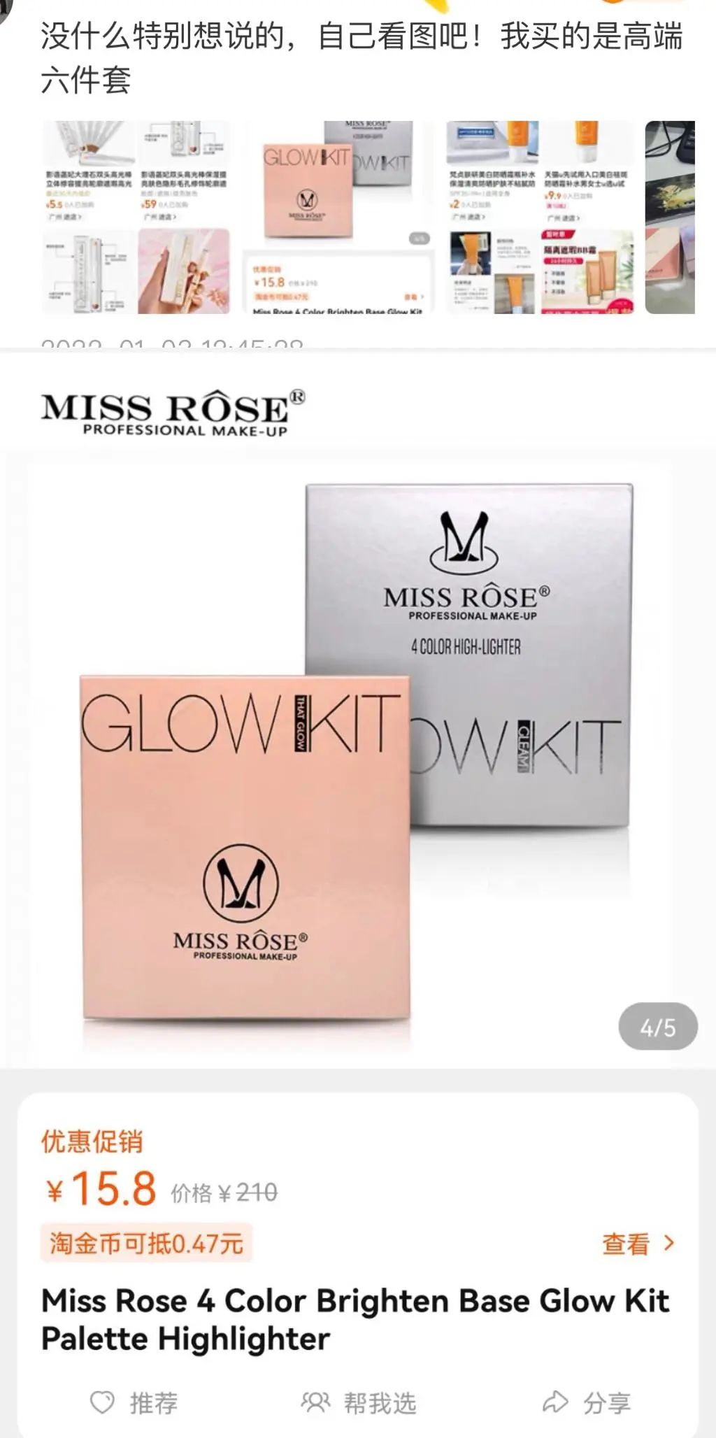 C2CC传媒记者点开商品窗口,发现售卖的多数是价格在个位数的美妆品,几乎是不知名品牌,包含一些一眼看上去是大牌山寨的产品。如包装像后Whoo的梦媚品牌套装,看上去像UNNY的UVVY粉底液等等。