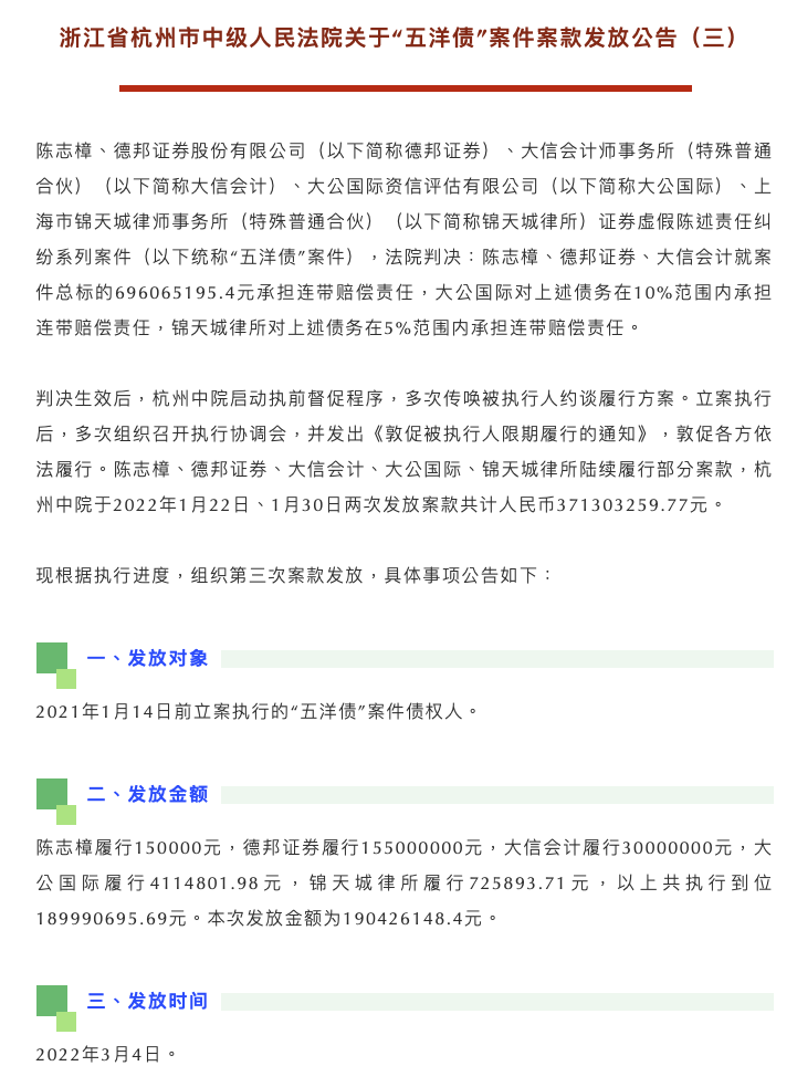 3月4日,杭州市中级人民法院发布关于“五洋债”案件案款发放公告:根据执行进度,杭州中院组织第三次案款发放,发放对象为2021年1月14日前立案执行的“五洋债”案件债权人,发放时间为3月4日。根据公告,陈志樟履行150000元,德邦证券履行155000000元,大信会计履行30000000元,大公国际履行4114801.98元,锦天城律所履行725893.71元,以上共执行到位189990695.69元。本次发放金额为190426148.4元。