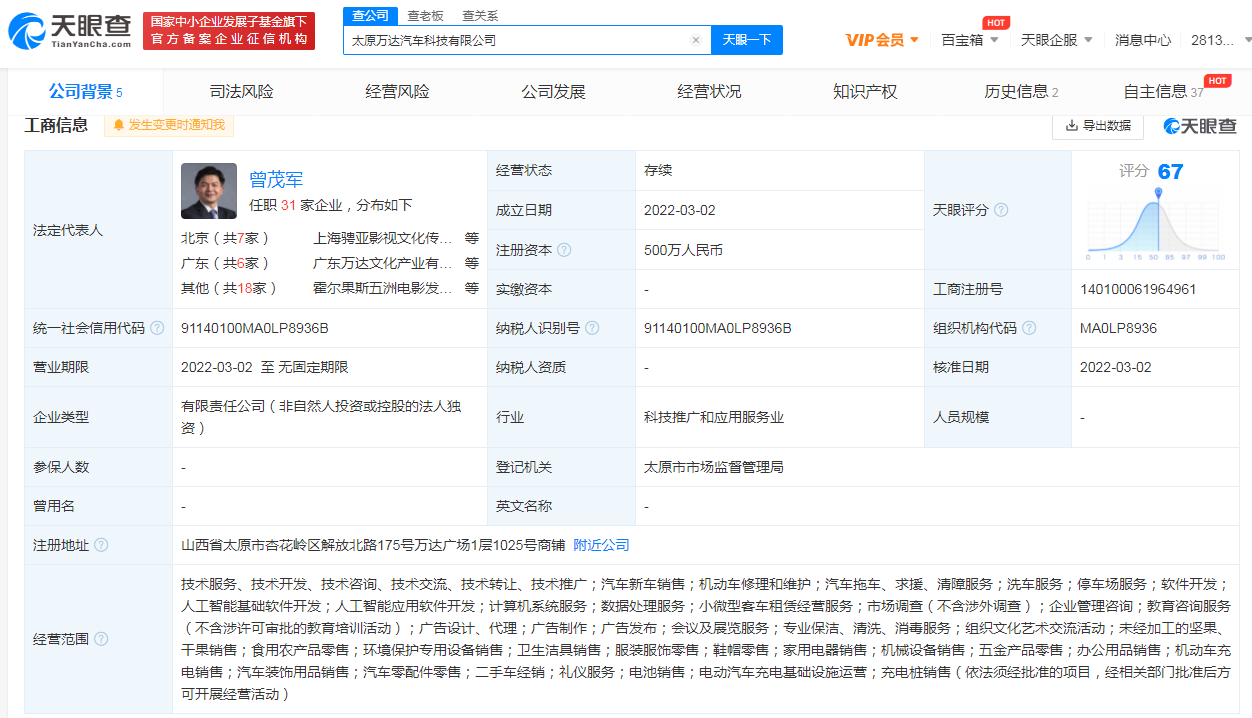 天眼查App显示,3月2日,太原万达汽车科技有限公司成立,法定代表人为曾茂军,注册资本500万人民币,经营范围含汽车新车销售;电池销售;电动汽车充电基础设施运营;充电桩销售等。股东信息显示,该公司由万达汽车科技服务有限公司全资持股。