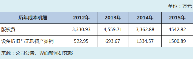 值得注意的是,暴风集团对于视频内容的版权费摊销,一样也是按照直线法摊销。一部三年的版权,每年摊销33%。而优酷采用的是加速摊销,同样三年的版权第一年摊销就要66%。撇开每年流量逐年递减的问题,采用直线法折旧的会计估计对于版权摊销前几年的利润影响是很大的。界面新闻粗略估算,假设按照加速摊销的方式,2013年将多出2000万左右的成本,从而减少2000万左右的利润,以此类推。