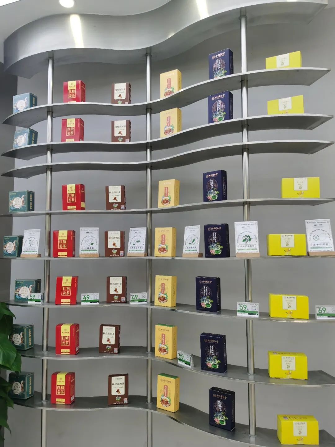 整体看来,“制茶司”的占地面积约80平米左右,进门左边是制茶区,右边是同仁堂的零售产品,包括枸杞、党参、菊花、雪梨草本膏、同仁堂陈皮茶等。再往里走有休闲区,4个小圆桌和固定的座位区,约可供6—8人用餐。座椅对面依旧是零售产品展示区,展示区一侧“北京同仁堂”logo显而易见。
