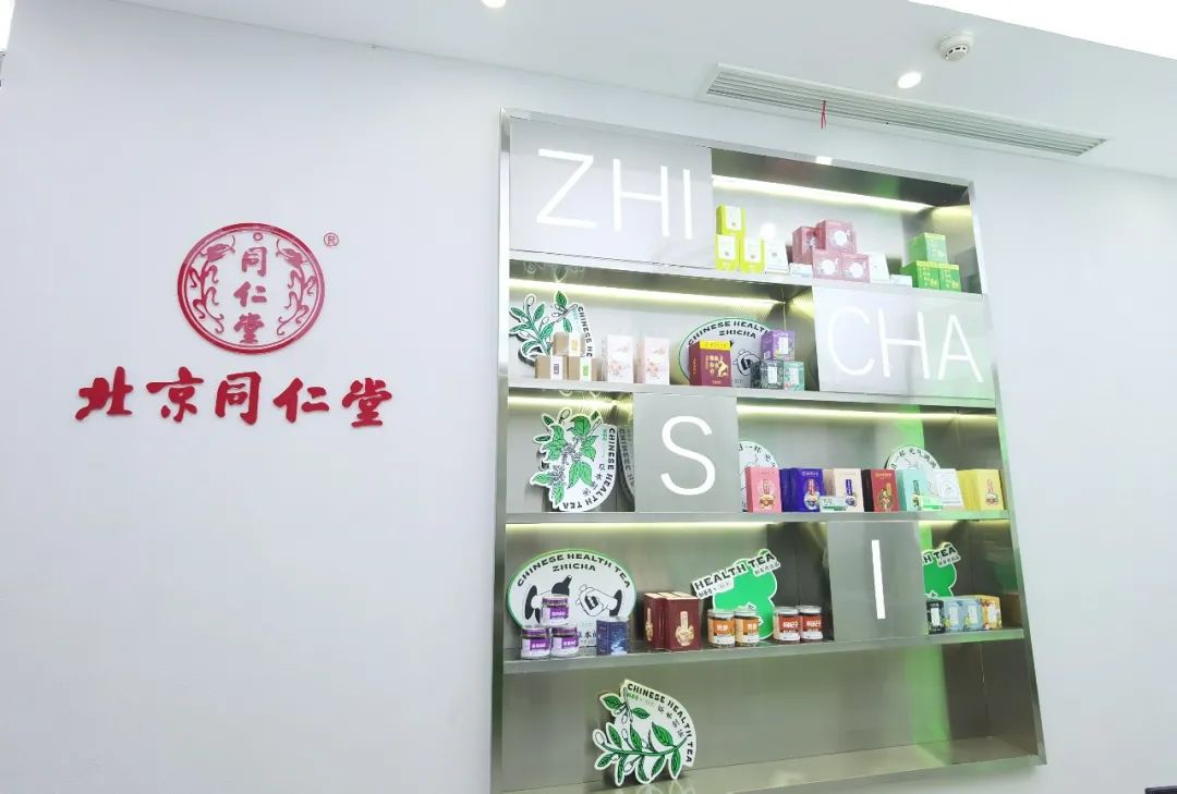 近看,“制茶司”门头是绿色的门店名称logo,与店内红色字体的“北京同仁堂”logo形成鲜明的反差。