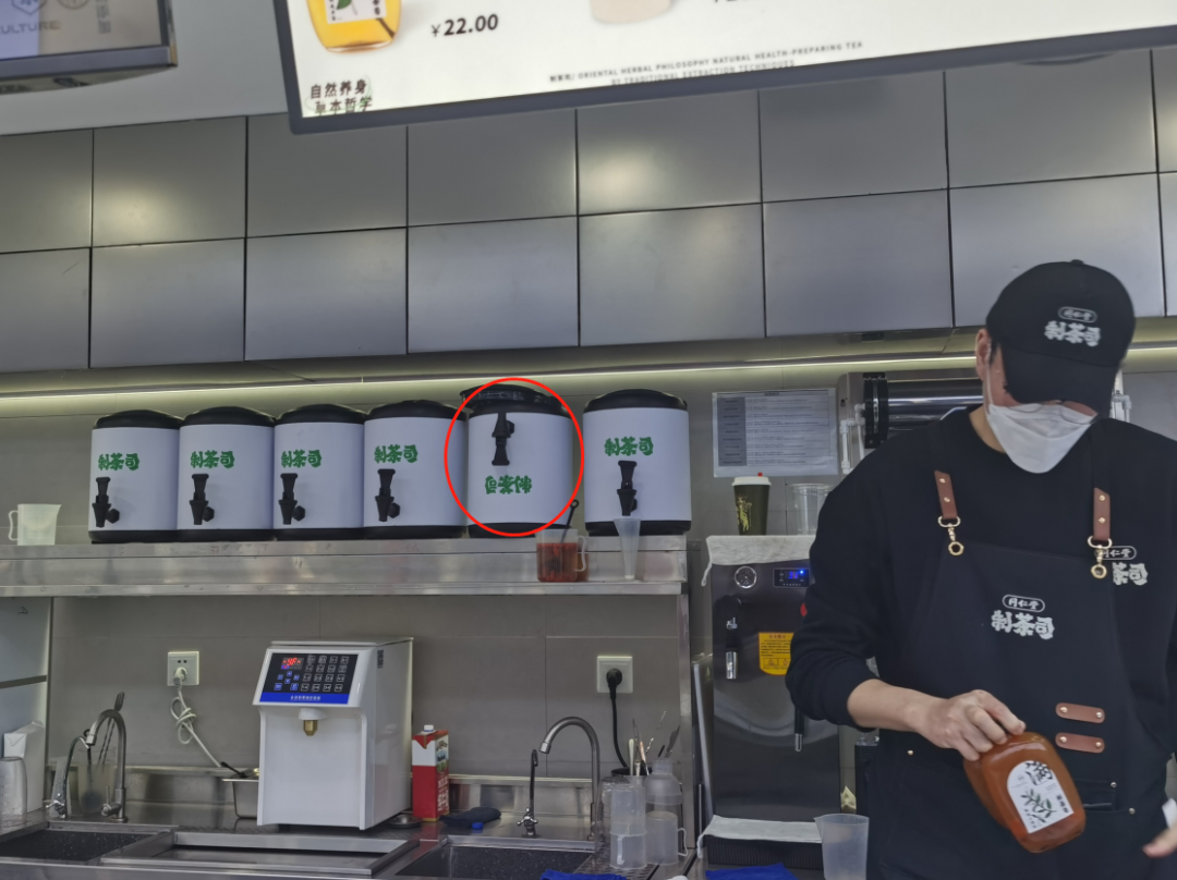 首先便是细节问题,看店一般先看门面,其次是制餐区。在制餐区的一隅,其中一个写有“制茶司”字样的保温桶具倒放是笔者的第一印象。