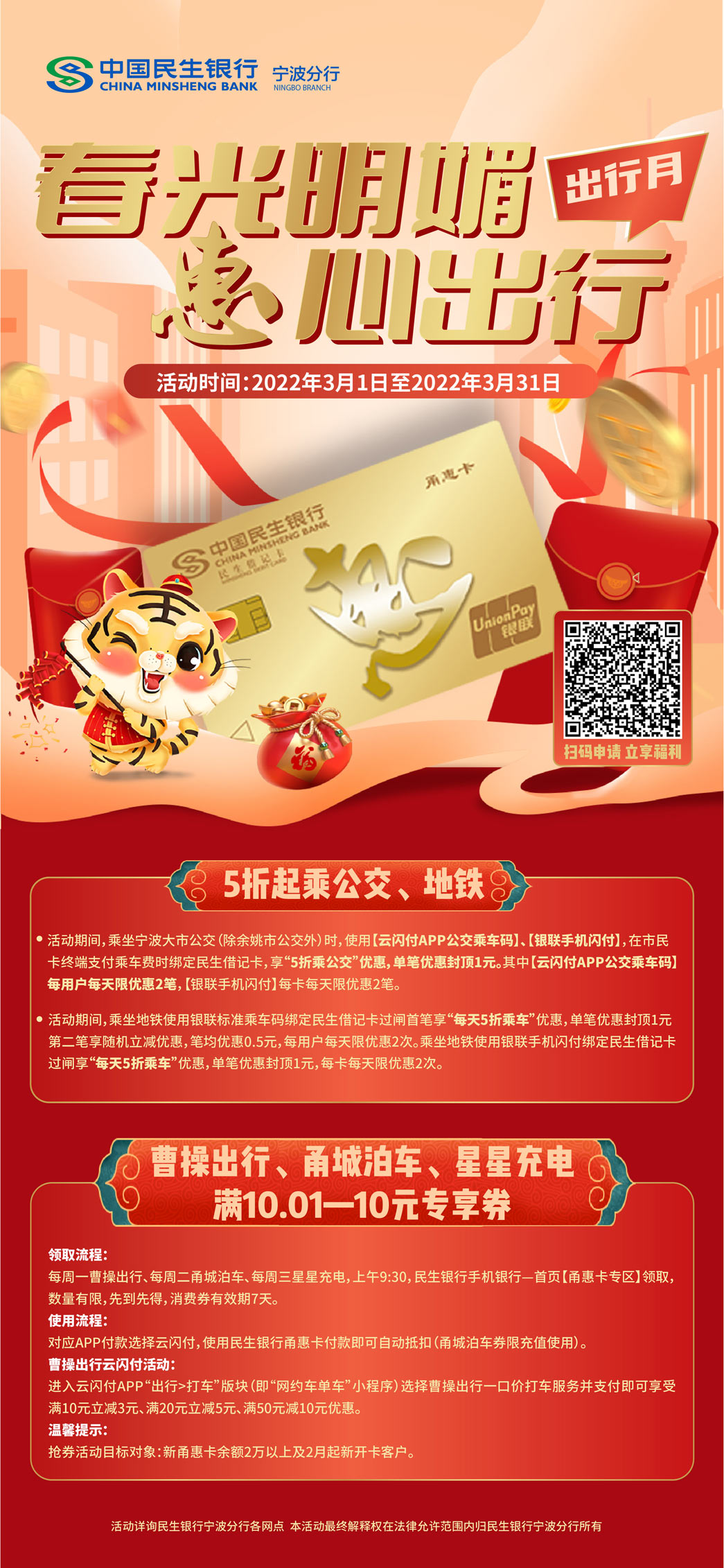 2022年3月1日至2022年3月31日,是民生银行甬惠卡“出行月”,五大福利已经给你安排好了: