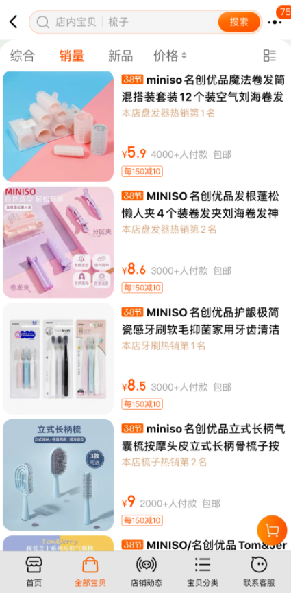 名创优品的“美好生活”依旧平价,只是主推商品从10元3双的袜子,变成了9.9元一包的洗脸巾、10元一支的眼线笔、9.9元一支的小苍兰淡香水。它们都是天猫店铺里最畅销的爆品。