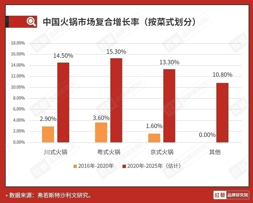 而粤式火锅则是增长速度最快的火锅赛道,行业呈上升之势。弗若斯特沙利文研究数据显示,2016年至2020年,粤式火锅的复合年均增长率为3.6%,远超川式火锅(2.9%)和京式火锅(1.6%);2020年至2025年,粤式火锅的复合年均增长率预计将达15.3%,继续领先川式火锅(14.5%)和京式火锅(13.3%)。2025年,粤式火锅的市场规模预计比2020年翻一番。