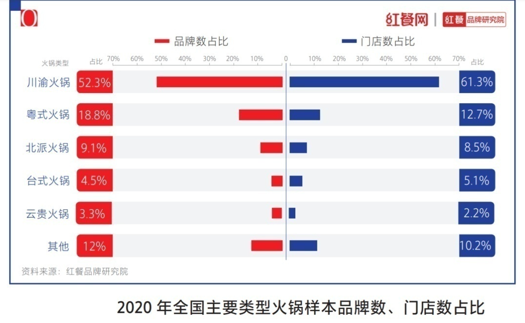 火锅,作为餐饮市场的一大品类,有着庞大的市场份额,备受瞩目。据红餐品牌研究院发布的《中国餐饮品类与品牌发展报告2021》,2020年全国火锅市场规模近6000亿元,有着近60万家门店。其中,以海底捞为首的川渝火锅品牌数占比为52.3%,门店数占比61.3%,由此来看,川渝火锅已经是火锅细分赛道中当之无愧的巨无霸。