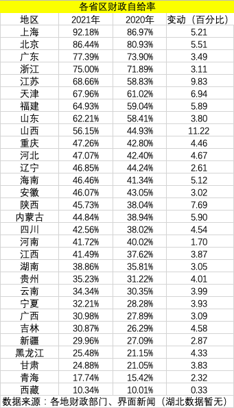 由此,山西省财政自给率从上年的44.9%升至56.2%,提高11.3个百分点,在所有省份中升幅最大;陕西省财政自给率从38%升至45.7%,提高7.7个百分点。