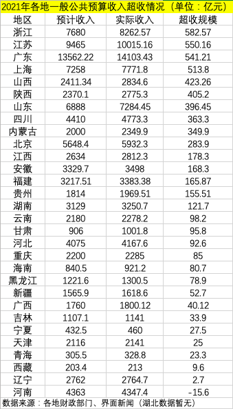 截至目前,除湖北之外,全国其他30个省份(包括自治区、直辖市)陆续公布了2021年财政收入。数据显示,除了受洪涝灾害影响的河南,其他地区财政收入都出现不同程度的超收,收入增速远超上年。其中,浙江、江苏、广东、上海一般公共预算收入比预计多收500亿元以上。