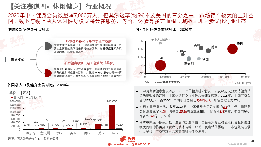 中国健身人群渗透率不足美国的三分之一,但市场仍处在上升期。线下健身与居家健身的商业模型都处于探索阶段,并不是此消彼长的对立关系,小白用户基数大,市场前景广阔。