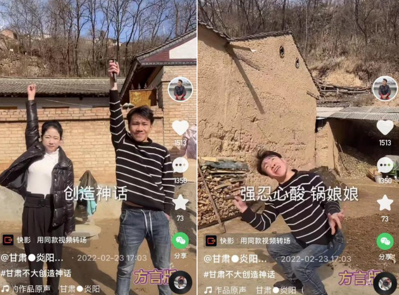 被人群嘲的西北喊麦,是炎阳夫妇的第三次尝试。最原始的喊麦只有炎阳一人参与,没有镜头的切换也没有多余的动作,后来才开始慢慢增加套路,口号也用过“甘肃经典,创造神话”,也不一定带着老婆出镜,身后偶尔会带俩兄弟,现在看到的两人走位、镜头的切换、以及经典动作的放慢与重复,都是反复试验的结果。
