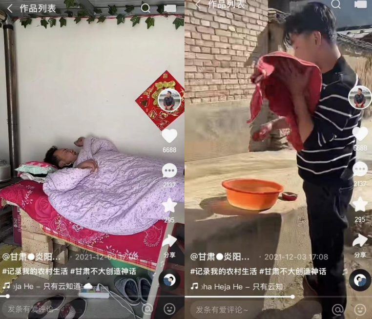 不久之后二人就开始转型。那时候,展现农村生活的张同学忽然火了起来,两个月疯狂涨粉超700万,成为了行业媒体笔下的流量新宠。炎阳决定开始模仿,一样的BGM、一样地从鸡鸣开始起床,一样地出来接水刷牙,取景就在自己的家里。
