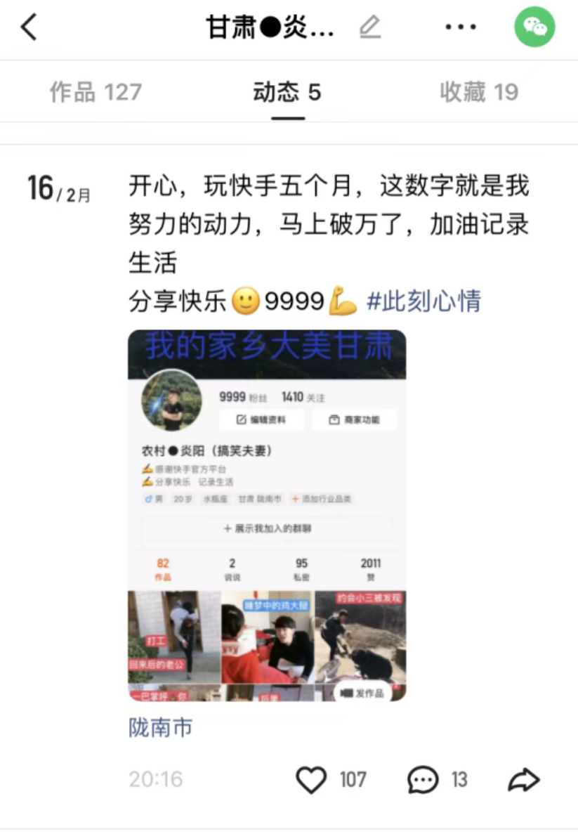 那么一个来自于西北欠发达地区、没有拿得出手的特色农产品、也没有走小镇做题家路线的年轻农民,在开始意识到“短视频经济”的重要性和可操作性之后,更好的选择是成为“新农人”还是“新大哥”?