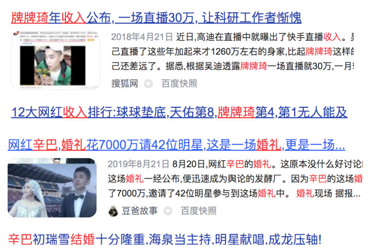 MC天佑顶峰时期月入百万都是基础配置,社会摇鼻祖牌牌琦结婚动用了大量豪车和直升机;自称“农民的儿子”辛巴结婚花了七千多万,成龙大哥都现身现场。这些都是被短视频创业者们快念叨烂了的光辉事迹。