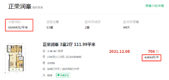 正荣润峯:目前二手房挂牌价约66444元/㎡,去年12月成交了一套近112㎡的房源,成交总价706万元,成交单价63042元/㎡。