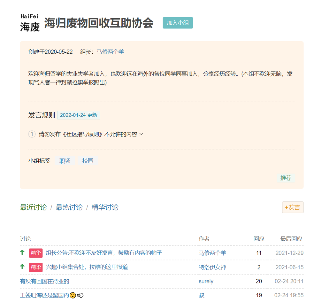 这种孤独感让他会去光顾豆瓣海归废物回收小组。