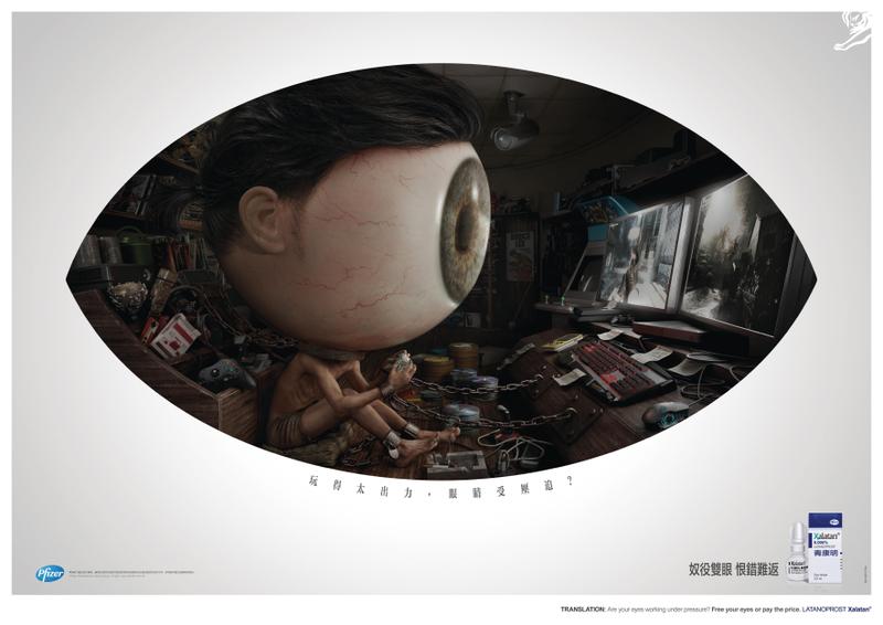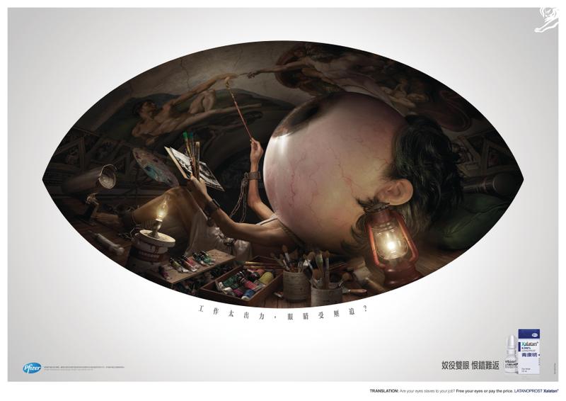 麦肯香港为辉瑞制药的一款眼药水制作了“眼球”系列的平面广告。它用一直红肿布满血丝的眼球描摹了几类用眼习惯糟糕的人群:学生、画家、游戏爱好者等。创意很直观的表现了眼疲劳的伤害,与眼药水产品自然的结合起来。