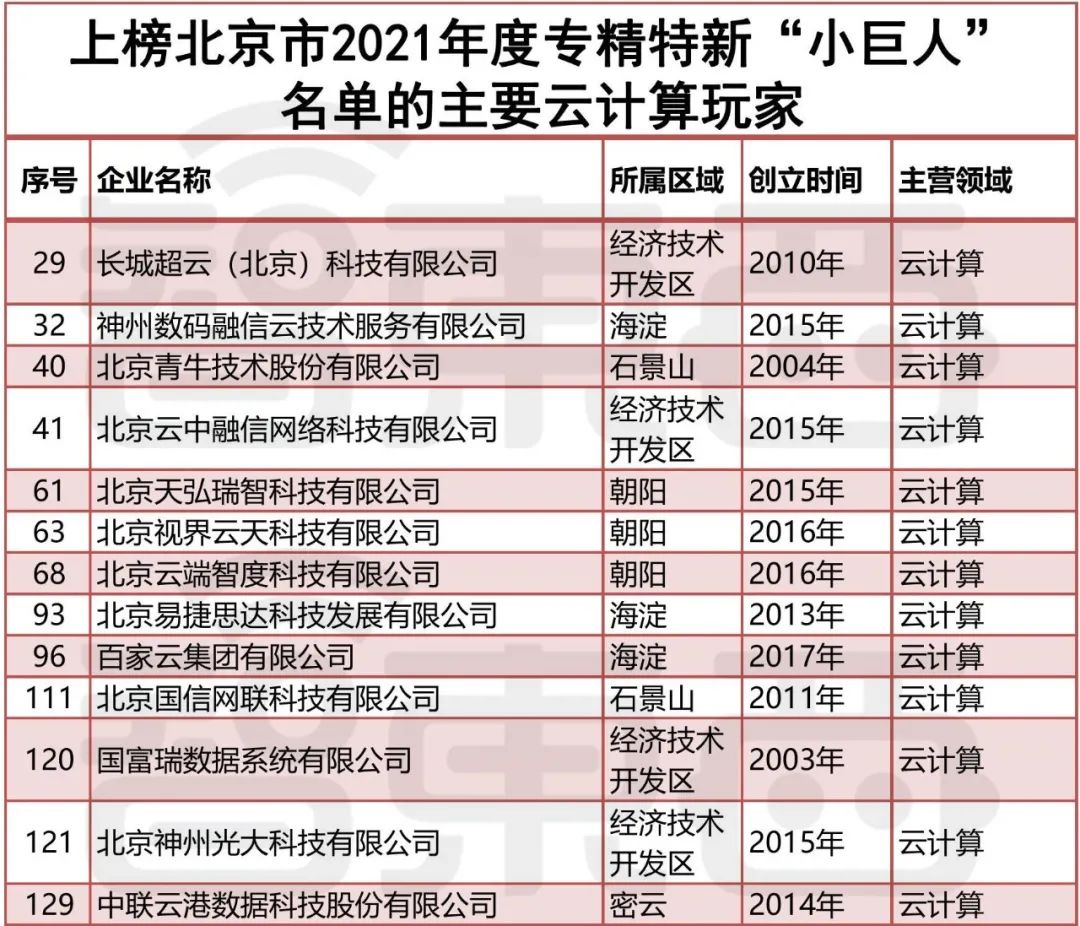 与数据息息相关的是计算,在2021年北京专精特新“小巨人”名单中,云计算领域的企业达到13个。