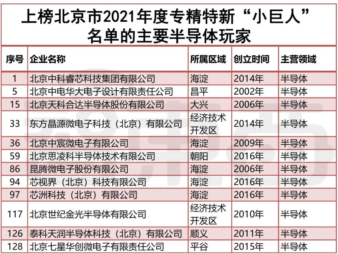 北京不是国内半导体发展最壮大的地区,但在北京2021年度专精特新“小巨人”中仍有12个半导体领域公司。也就是说每十家智能产业企业中,就有一家是做半导体的。