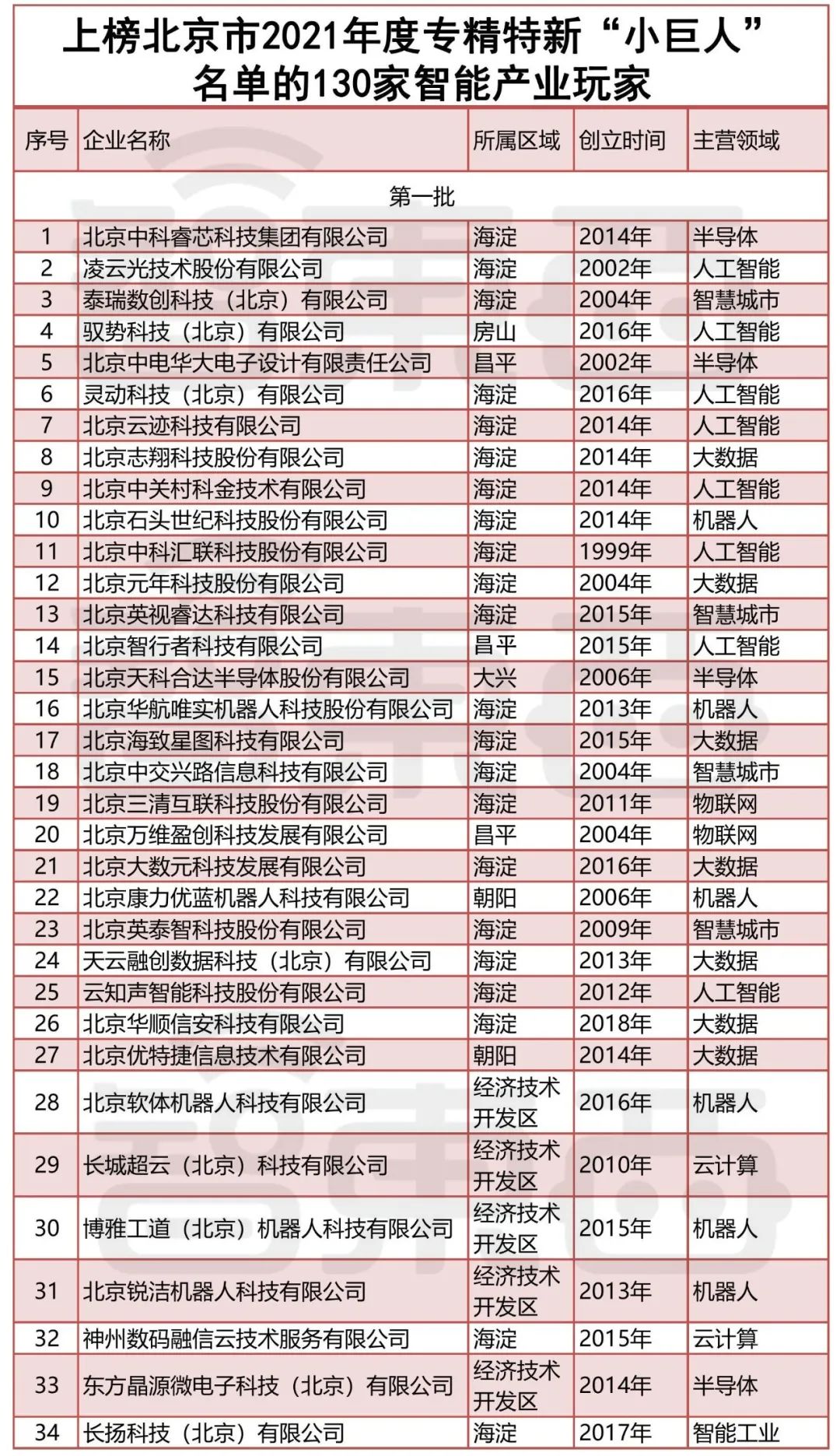 智东西3月4日报道,本周,北京经信局公布了第二批2021年度专精特新“小巨人”名单。结合此前公布的第一批名单,我们发现在1036家上榜企业中,有大约130家企业分布在智能产业。这些智能产业“小巨头”,代表了当下中国部分最前沿的智能“硬科技”实力。
