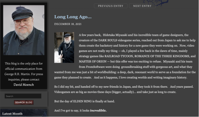 乔治·马丁作为《艾尔登法环》游戏世界观的架构者,自己却不是一个游戏爱好者。但也正因为这样,马丁可以以一个独立的视角跳出游戏本身,为每一个游戏玩家和角色构建一个全面的世界观。